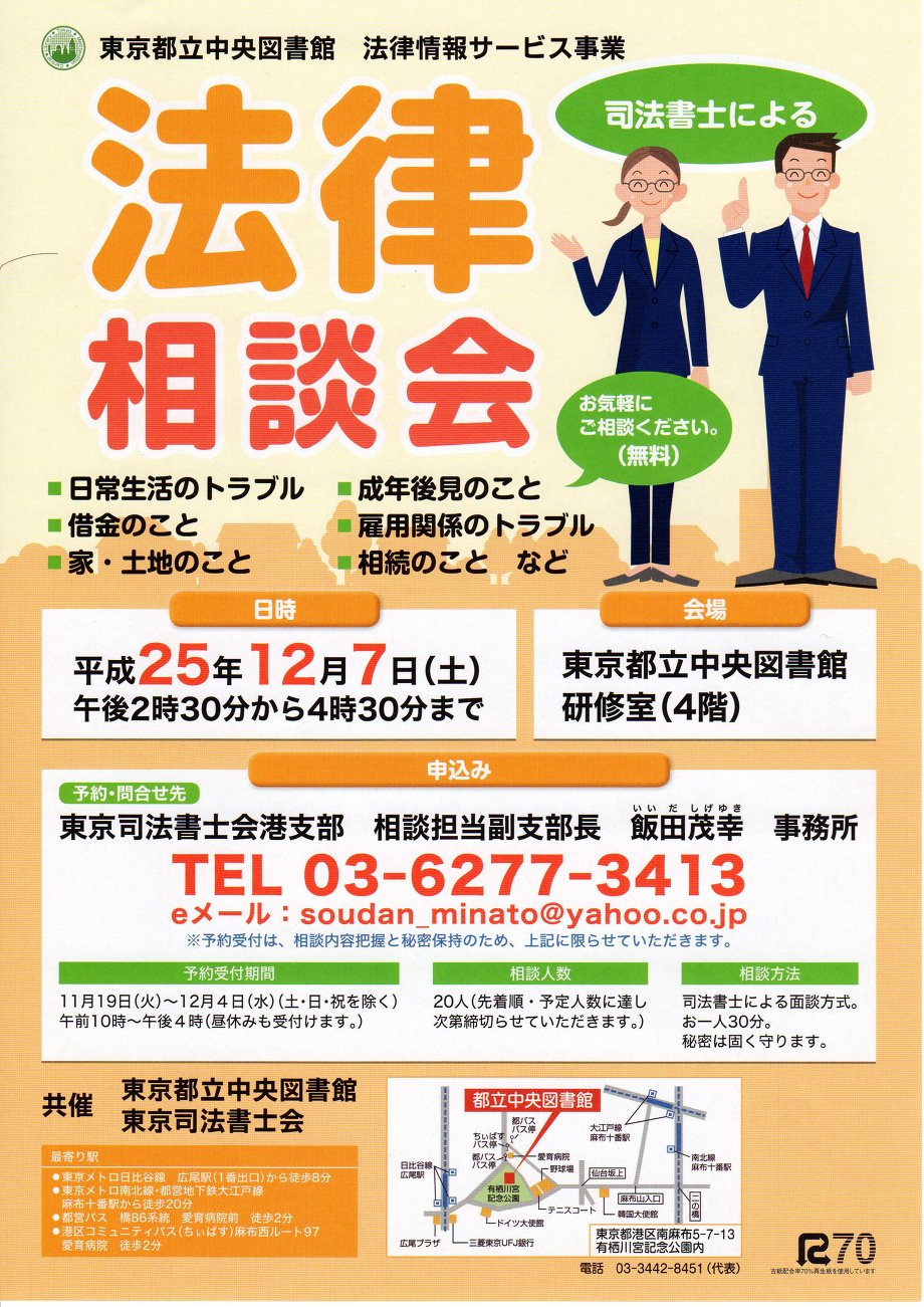 東京司法書士会港支部は、広尾にある都立中央図書館にて法律相談会をします。
